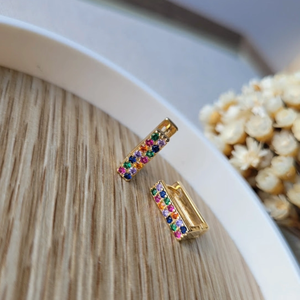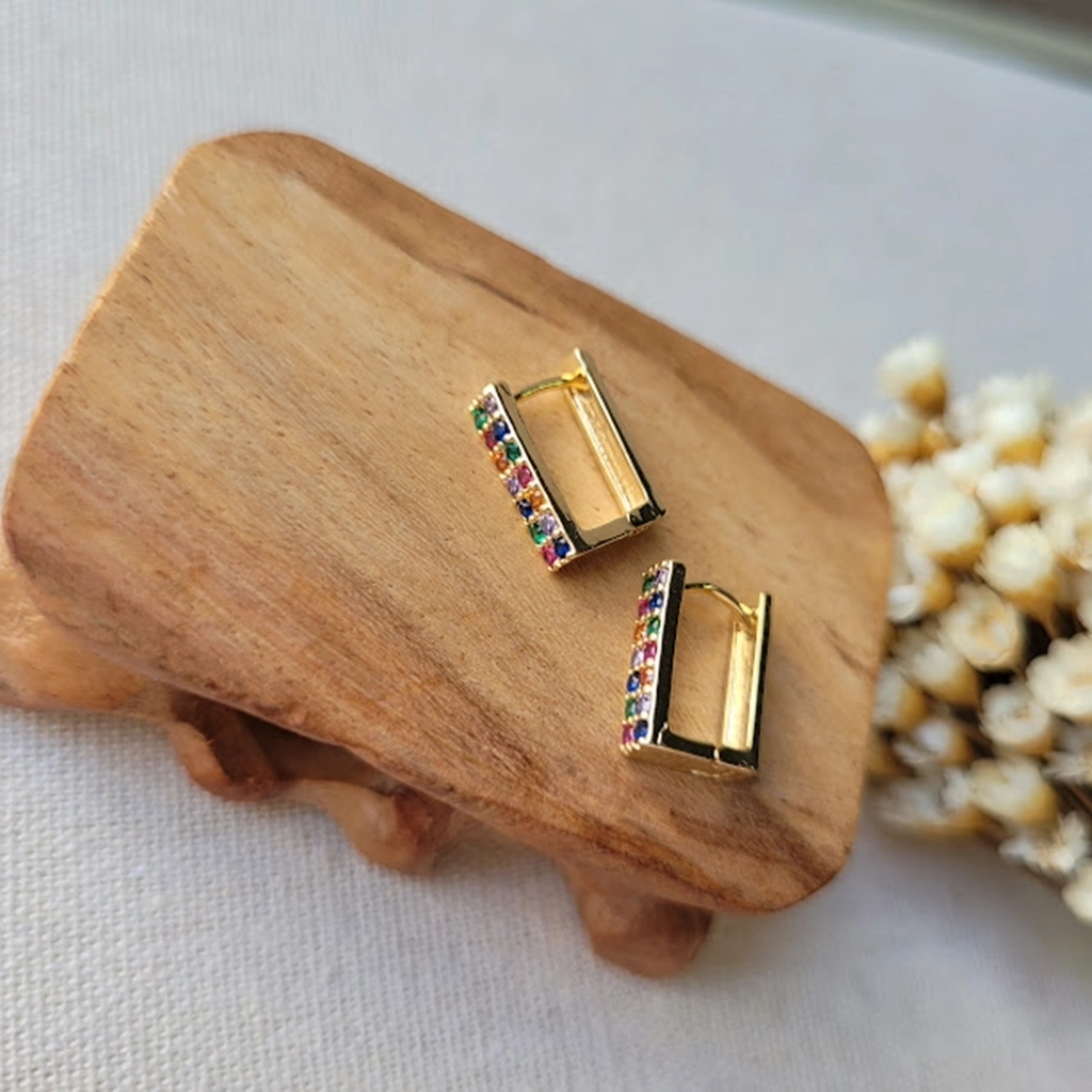Argola Retangular Cravejada Colorida – Banhado a Ouro 18K