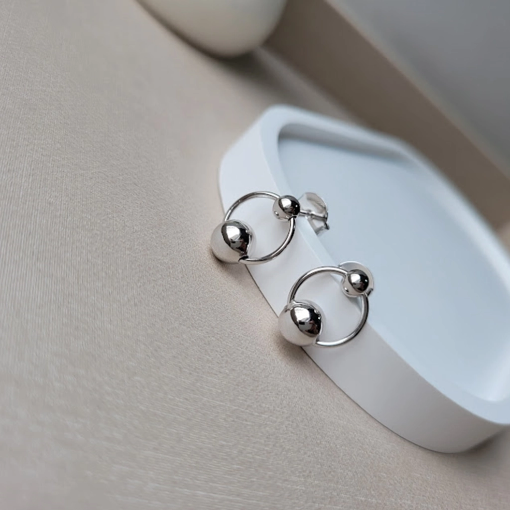 Brinco Círculo com Dupla Bolinhas – Ródio Branco