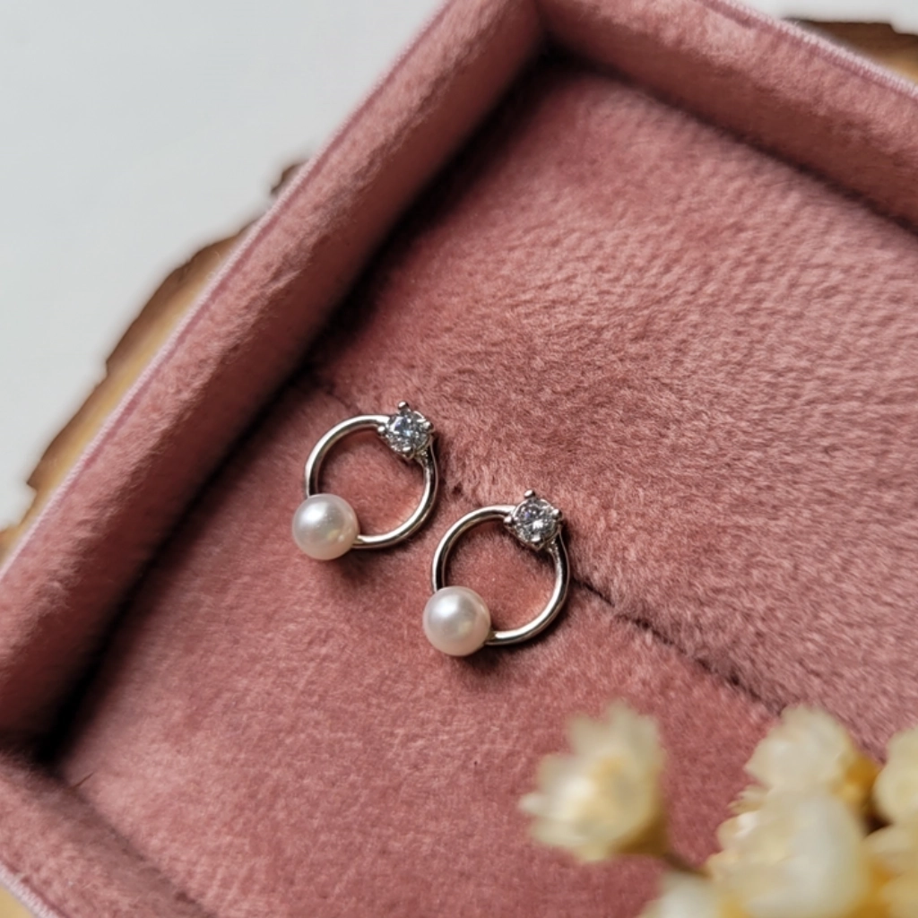 Brinco Círculo Cristal e Pérola – Ródio Branco
