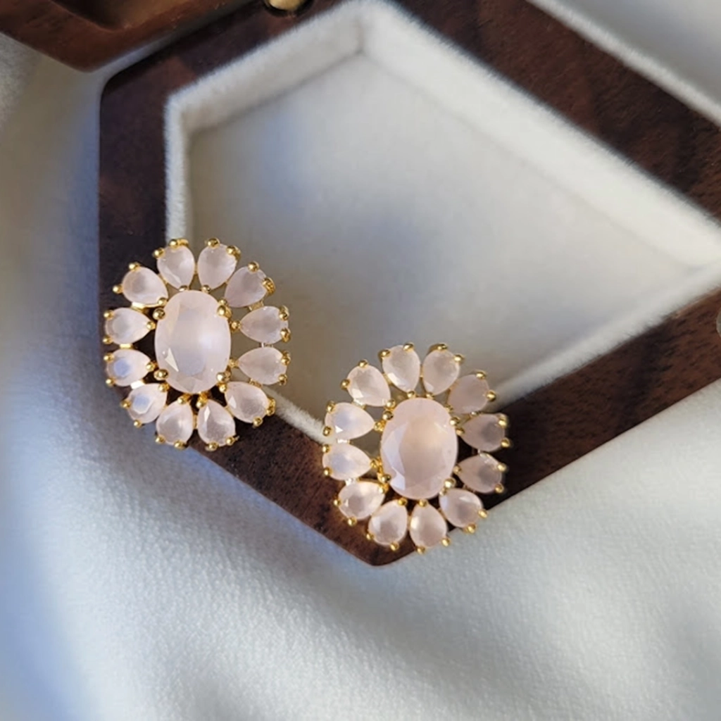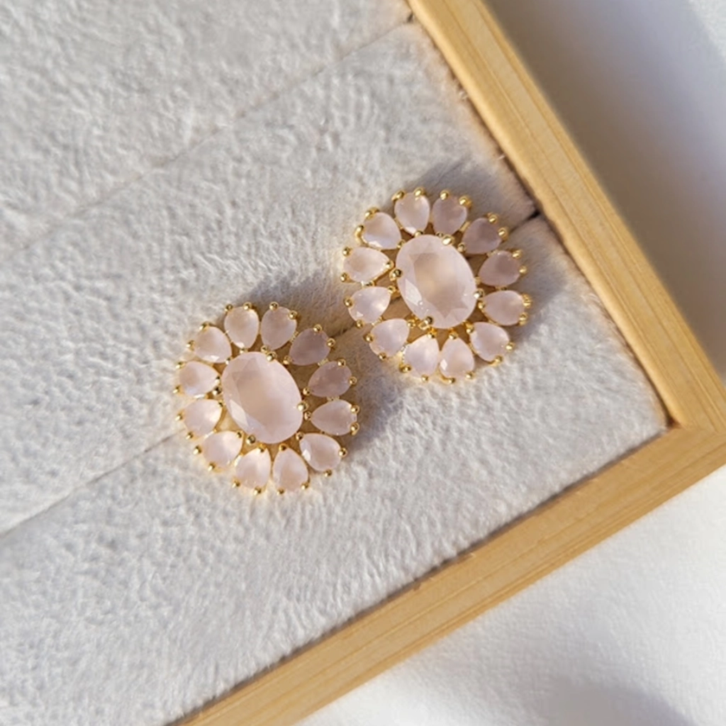 Brinco Oval Cravejado Rosa Leitoso – Banhado a Ouro 18K