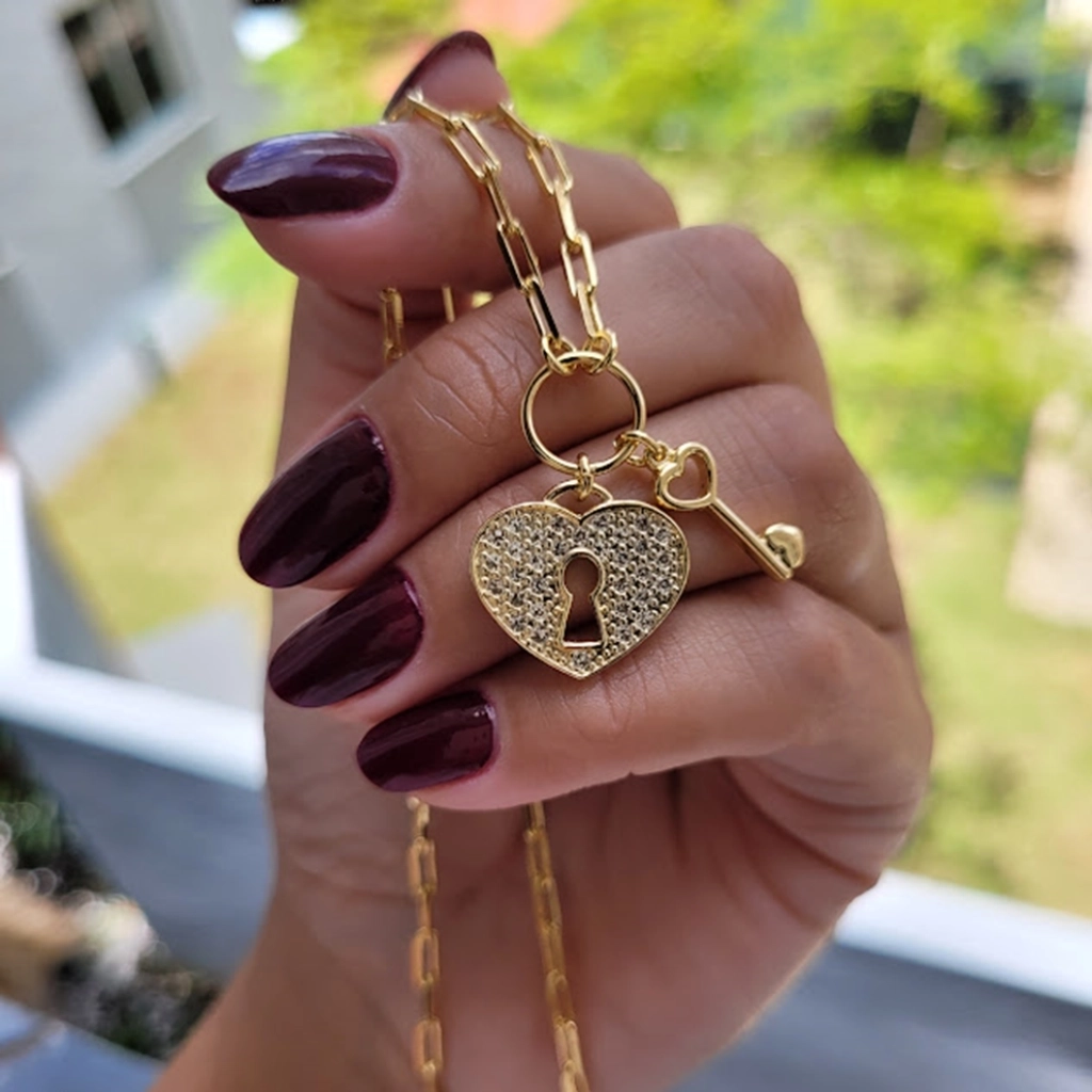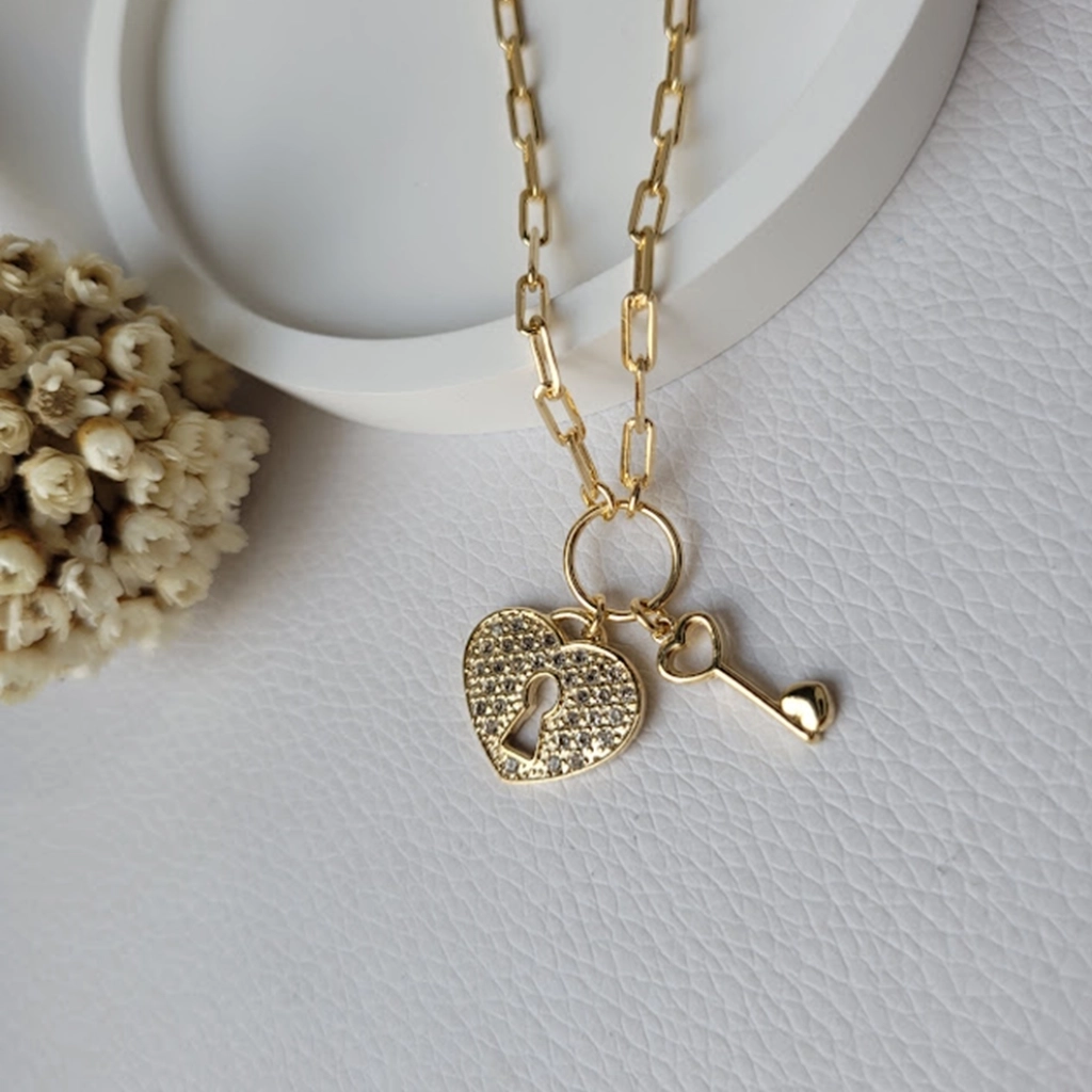 Colar Chave e Cadeado Coração Cristal – Banhado a Ouro 18K