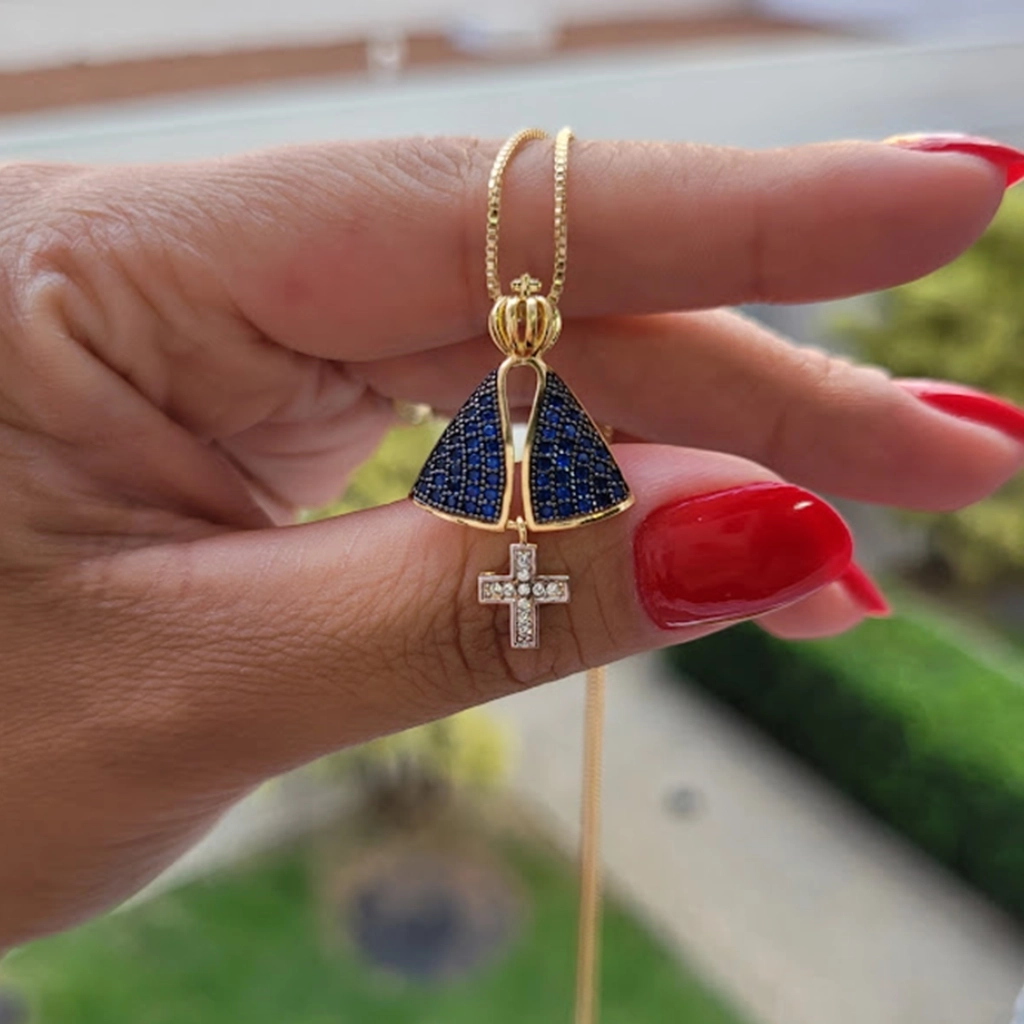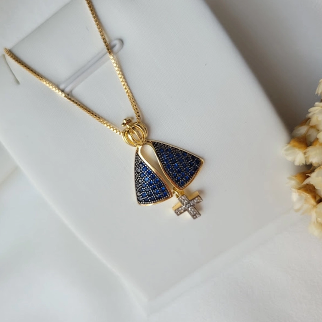 Colar Nossa Senhora Aparecida com Cruz Cravejado Cristal – Banhado a Ouro 18K