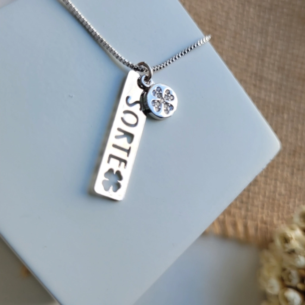 Colar Plaquinha Sorte e Trevo Cristal – Ródio Branco
