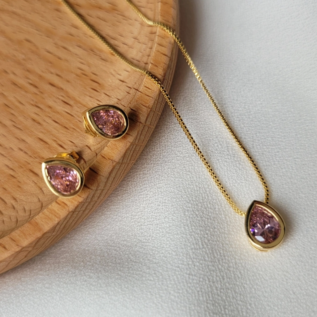 Conjunto Gota Fusion Inglesa Quartzo Rosa – Banhado a Ouro 18K