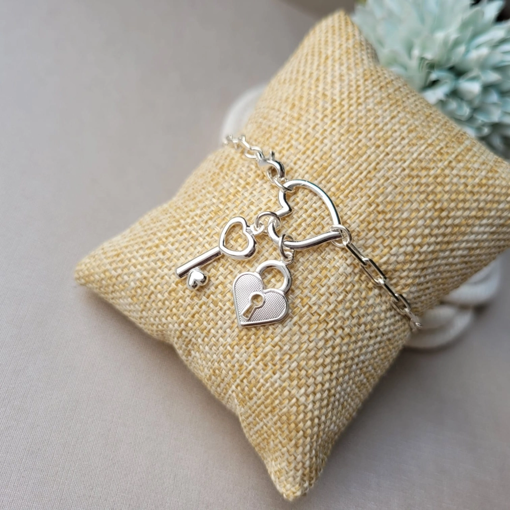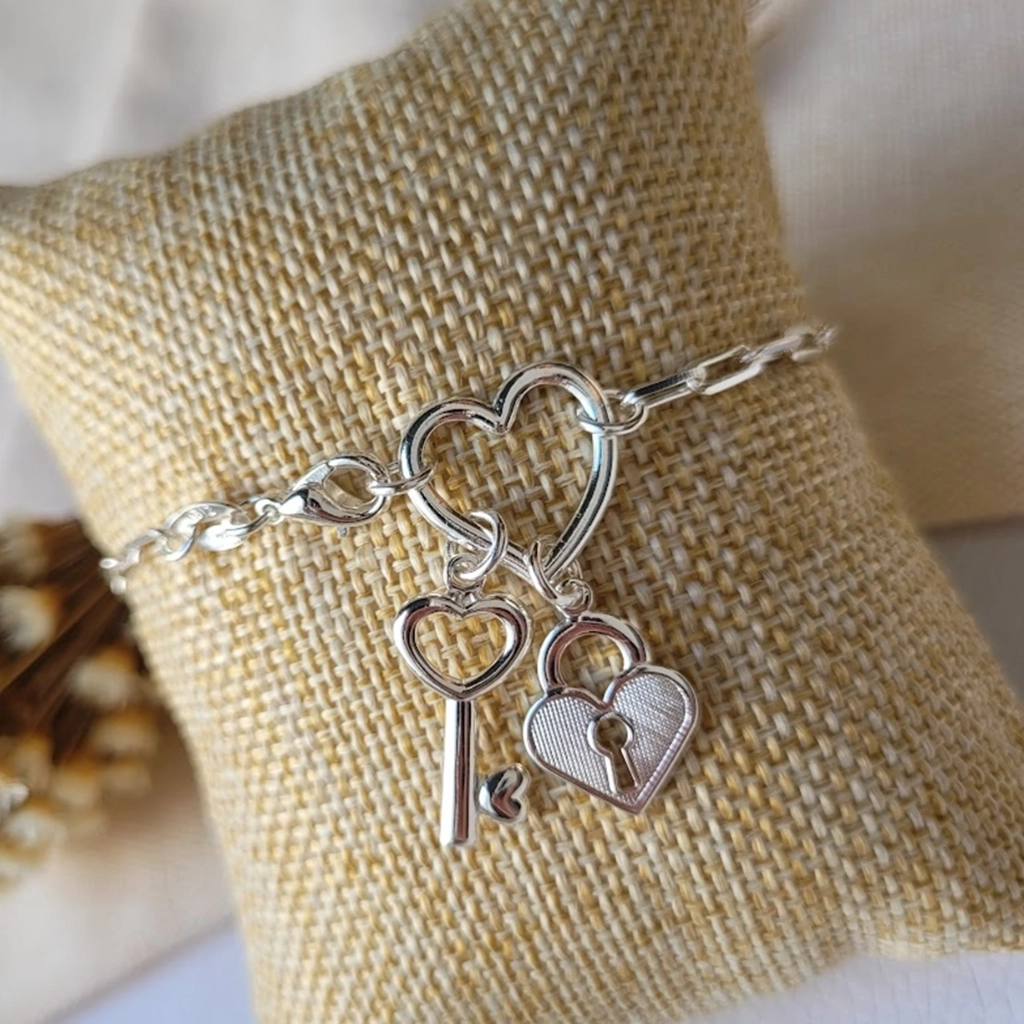 Pulseira Coração com Chave e Cadeado – Folheado a Prata