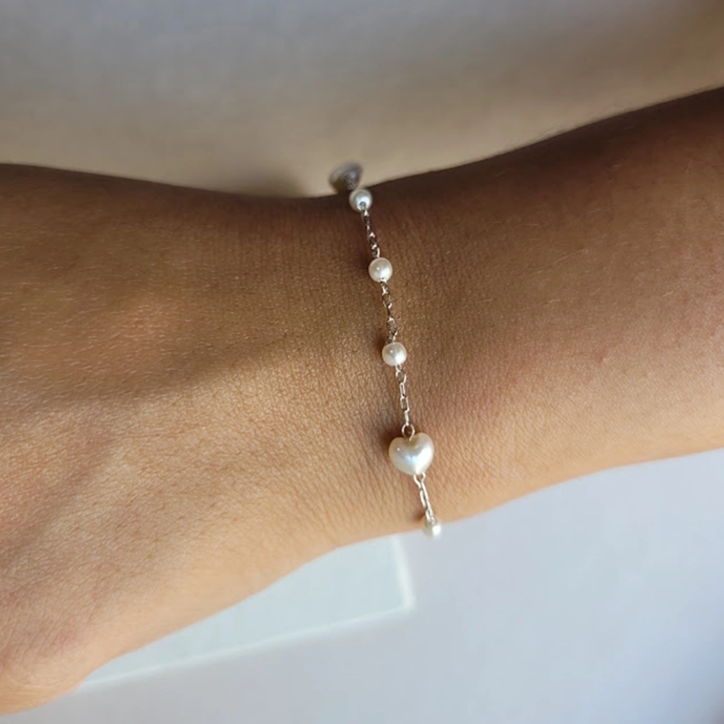 Pulseira Corações e Bolinhas Pérolas – Ródio Branco
